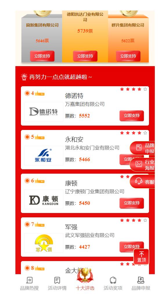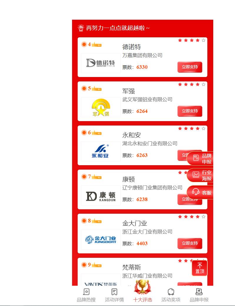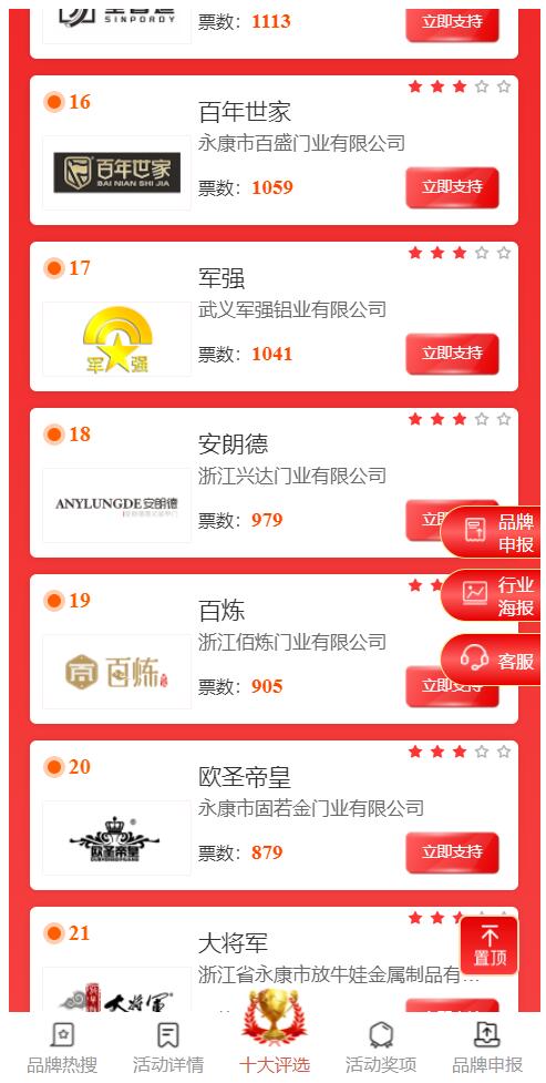 本次網(wǎng)絡評選300余家,囊括國內所有中高端鑄鋁門生產廠家。通過短短幾天時間的投票,武義軍強鋁藝有限公司得到網(wǎng)民的廣大認可,從第17名快速升到第4名,從而顯現(xiàn)出軍強品牌在社會的影響力、知名度以及網(wǎng)民的認可度。